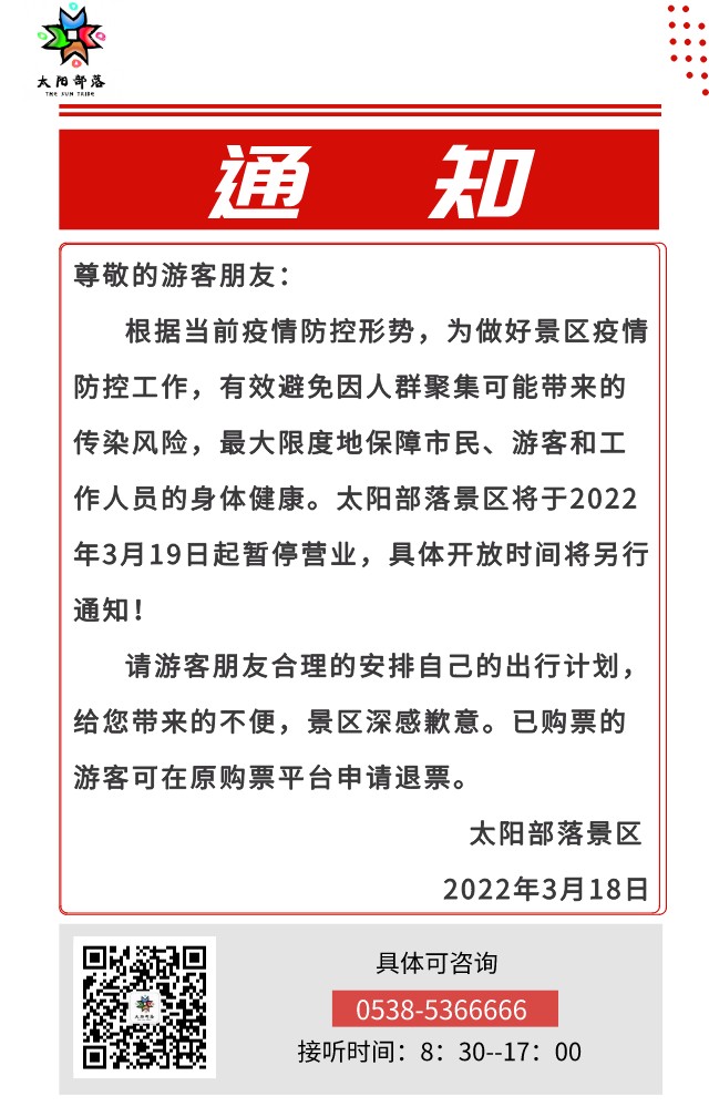 關(guān)于泰安太陽部落景區(qū)的暫時閉園通知